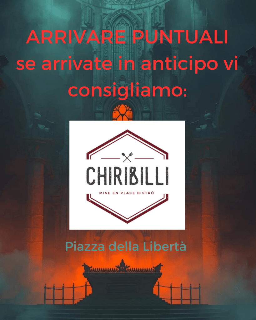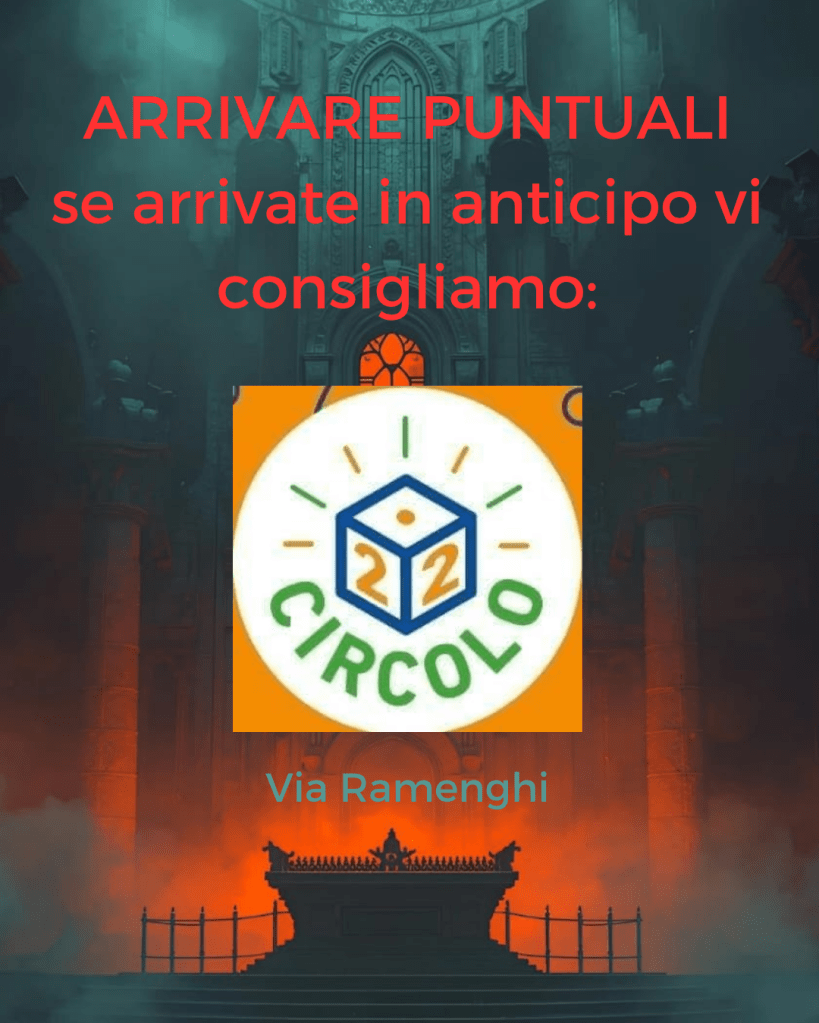 Indossare scarpe e abbigliamento comodo. Il gioco sarà diviso su più location, sarà necessario spostarsi. Alcuni enigmi potrebbero sporcarvi/bagnarvi. In caso di pioggia munirsi di ombrelli.